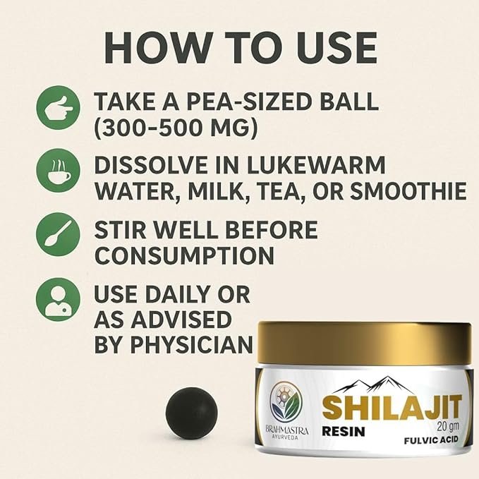 Measure 250-500 mg of BRAHMASTRA AYURVEDA Himalaya Shilajit Resin using the provided spoon, dissolve it in lukewarm water or milk, and consume twice daily or as directed by your healthcare provider. Consistent use contributes to improved stamina, energy, and holistic wellness.